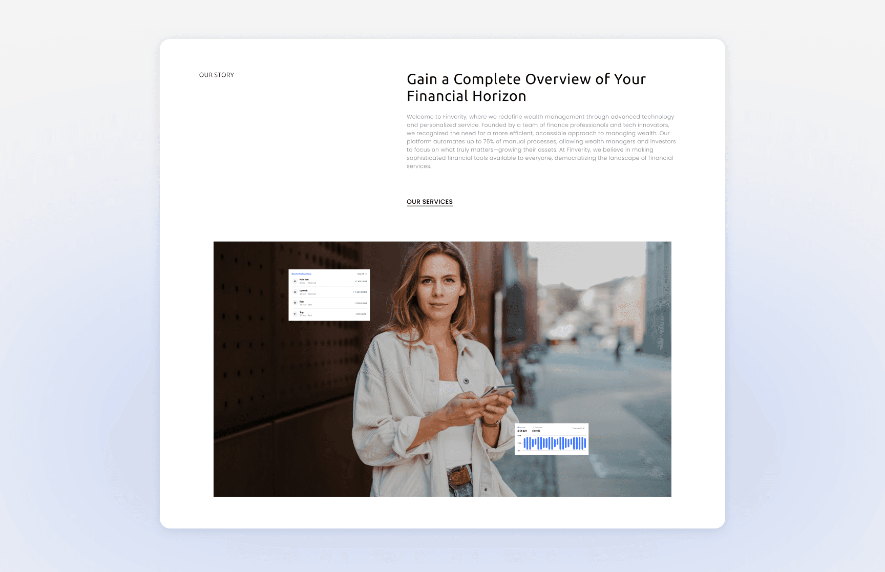Finverity is redefining wealth management by combining technology with personalized financial services. Our goal was to create a sleek, trustworthy online presence that reflects their mission — making wealth management more accessible and user-centered. Digital Builders designed a 7-page Webflow website with a clean UX structure and high-trust visual identity. Beyond the frontend, we built operational infrastructure using Airtable for database management and Notion as a collaboration hub, helping the team work faster and more efficiently. This project went beyond design — it formed the digital backbone for Finverity’s client experience and internal operations.